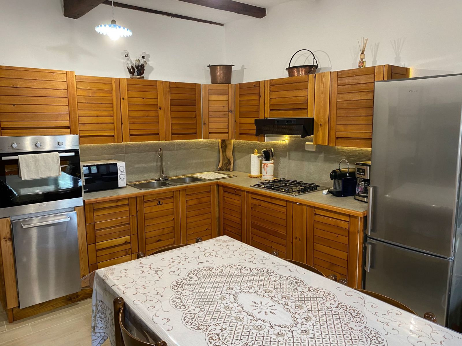 Die Küche ist komfortabel ausgestattet mit Geschirrspüler, Backofen und Kaffeemaschine.